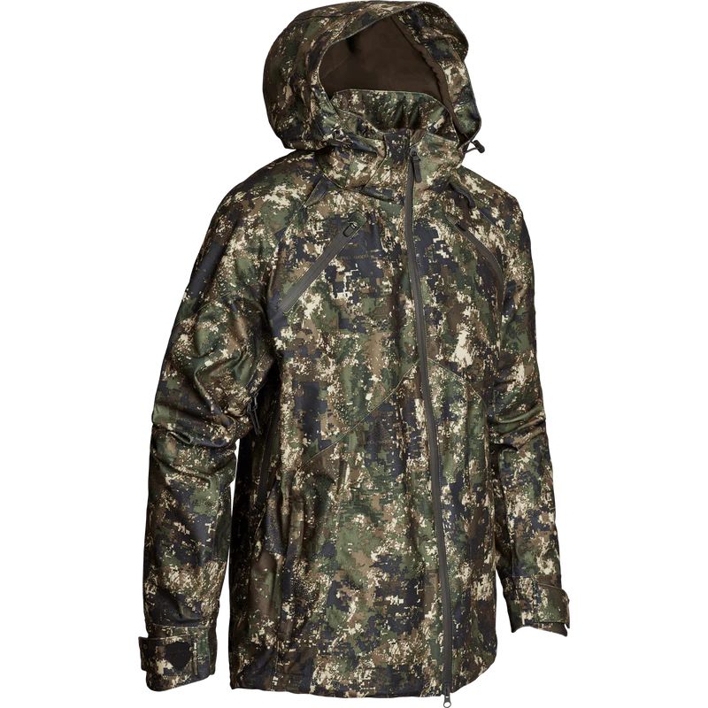 Куртка Skjold Ask изготовлена из тихого и лёгкого материала и оснащена мембраной ADDVENTEX™ ECO 10.20, которая делает её ветронепроницаемой, водонепроницаемой и «дышащей». Куртка имеет проклеенные швы, вентиляционные молнии для оптимальной воздухопроницаемости и съёмный трёхсторонний регулируемый капюшон. Камуфляжный принт TECL-WOOD™ создан для северных лесов и особенно подходит для осени и зимы.
