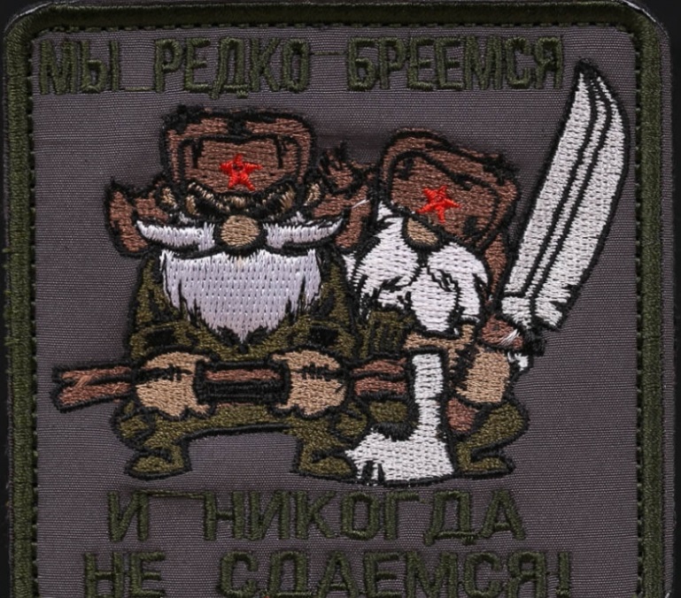 Изображение на нашивке: два злых бородатых русских мужика в шапках ушанках и оружием в руках.