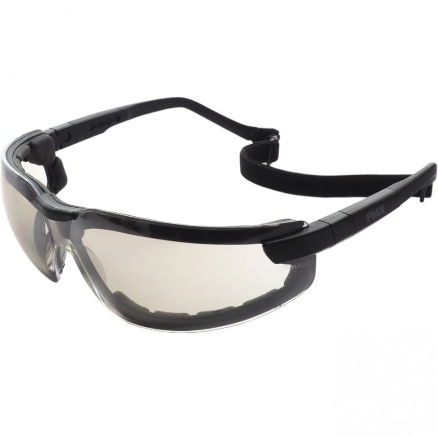 Очки c зеркально-серыми ударопрочными поликарбонатными линзами светопропускаемостью 50% спереди и сбоку от частиц, летящих со скоростью 400м/с.